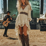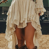 Women's Solid Color Deep V-Neck Lace Trim Retro Dress With Asymmetrical Hem And Long Sleeve Lining Midi Dress