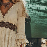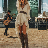 Step into timeless elegance with this stunning vintage-inspired midi dress. Designed to captivate, it masterfully blends classic romance with modern sophistication. The dramatic deep V-neckline elongates the silhouette, while the delicate lace trim and flowing asymmetrical hem create a look that is both feminine and powerfully chic.